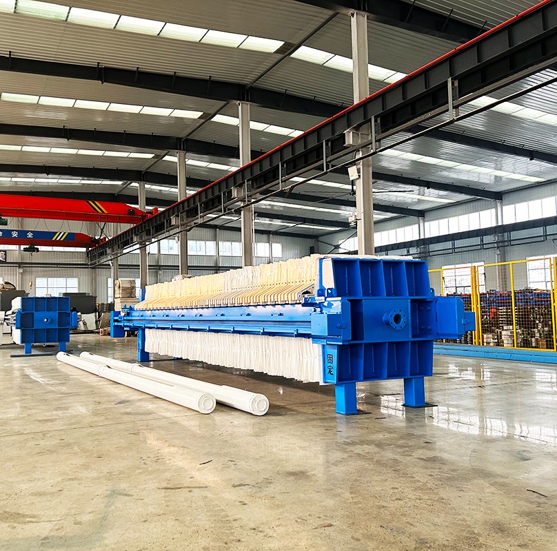 板框廂式隔膜壓濾機通過交替排列的濾板和濾框形成濾室。在液壓系統(tǒng)的作用下,濾板被壓緊,形成封閉的腔室。待處理的物料(如污泥)被泵入濾室,在壓力作用下,液體通過濾布排出,固體顆粒則被截留在濾布上形成濾餅。隔膜板的特殊設(shè)計允許在濾室內(nèi)充滿濾餅后,通過向隔膜內(nèi)注入高壓流體介質(zhì),使隔膜鼓起,對濾餅進行進一步壓榨,實現(xiàn)更高效的固液分離。