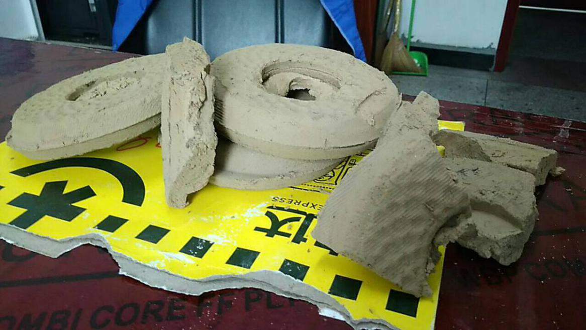 實(shí)驗(yàn)結(jié)果1),30分鐘進(jìn)料實(shí)驗(yàn):含水率40%-45%左右,泥餅形態(tài):外側(cè)大部分泥餅成型,內(nèi)有一部分包漿,包漿厚度8毫米