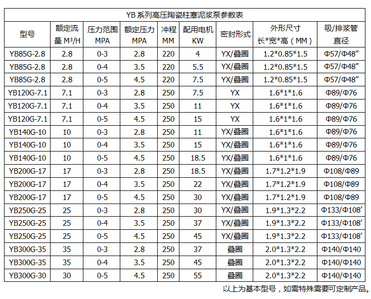 該泵為YB系列改進型,高壓力為3Mpa,4Mpa,5Mpa三個等級,可輸送高濃度高粘度及含有顆粒的懸浮漿液,不用裝底閥可直接抽吸液體運轉(zhuǎn)平穩(wěn)、噪聲小。結(jié)構(gòu)簡單、拆裝維修方便。根據(jù)壓力合理選配電機,大程度提高效率。